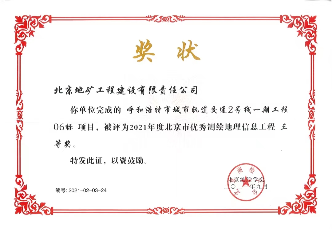2021年呼和浩特軌道交通測繪獎狀