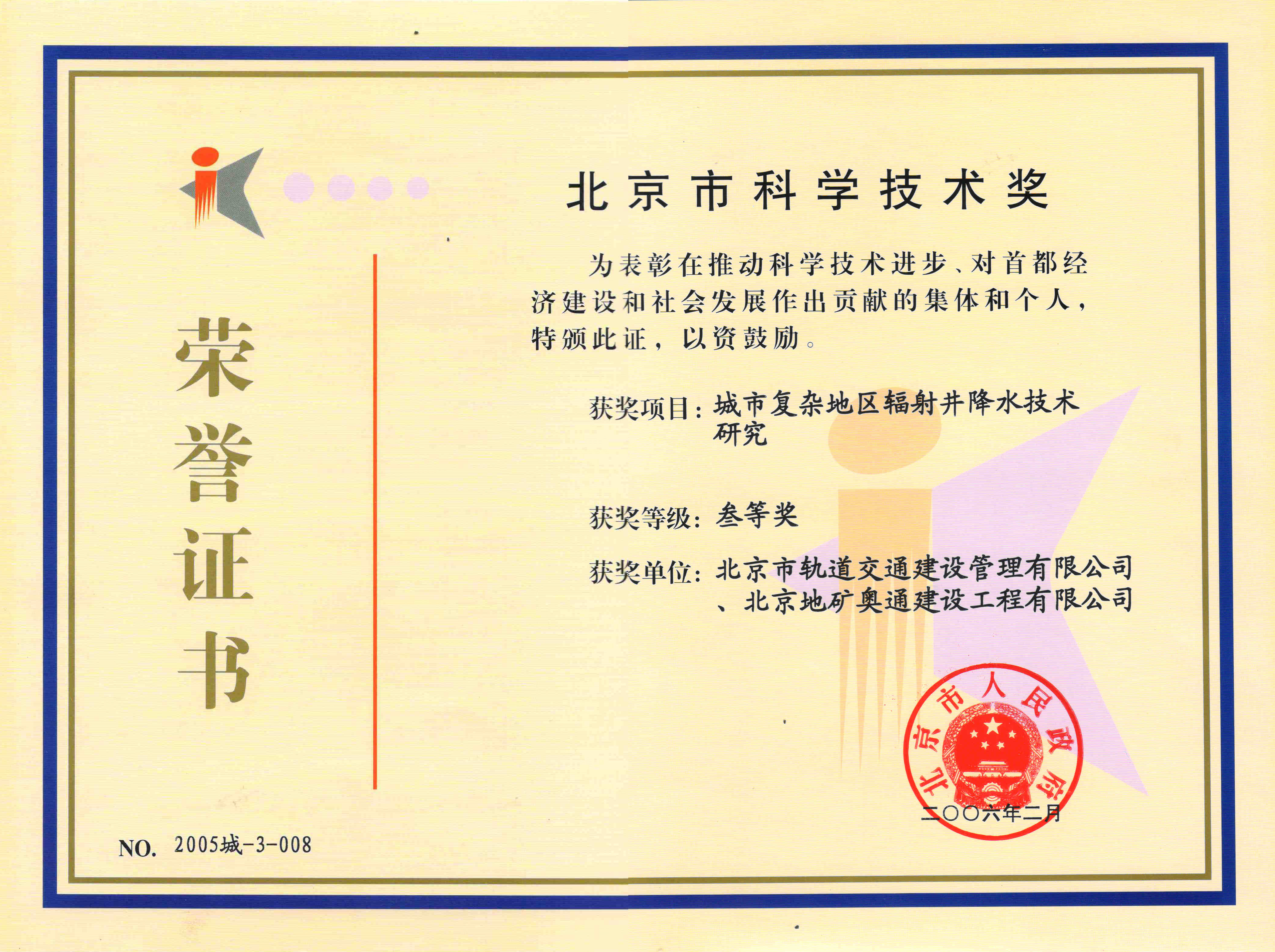 北京市科學技術(shù)獎叁等獎城市復雜地區(qū)輻射井降水技術(shù)研究(集體)