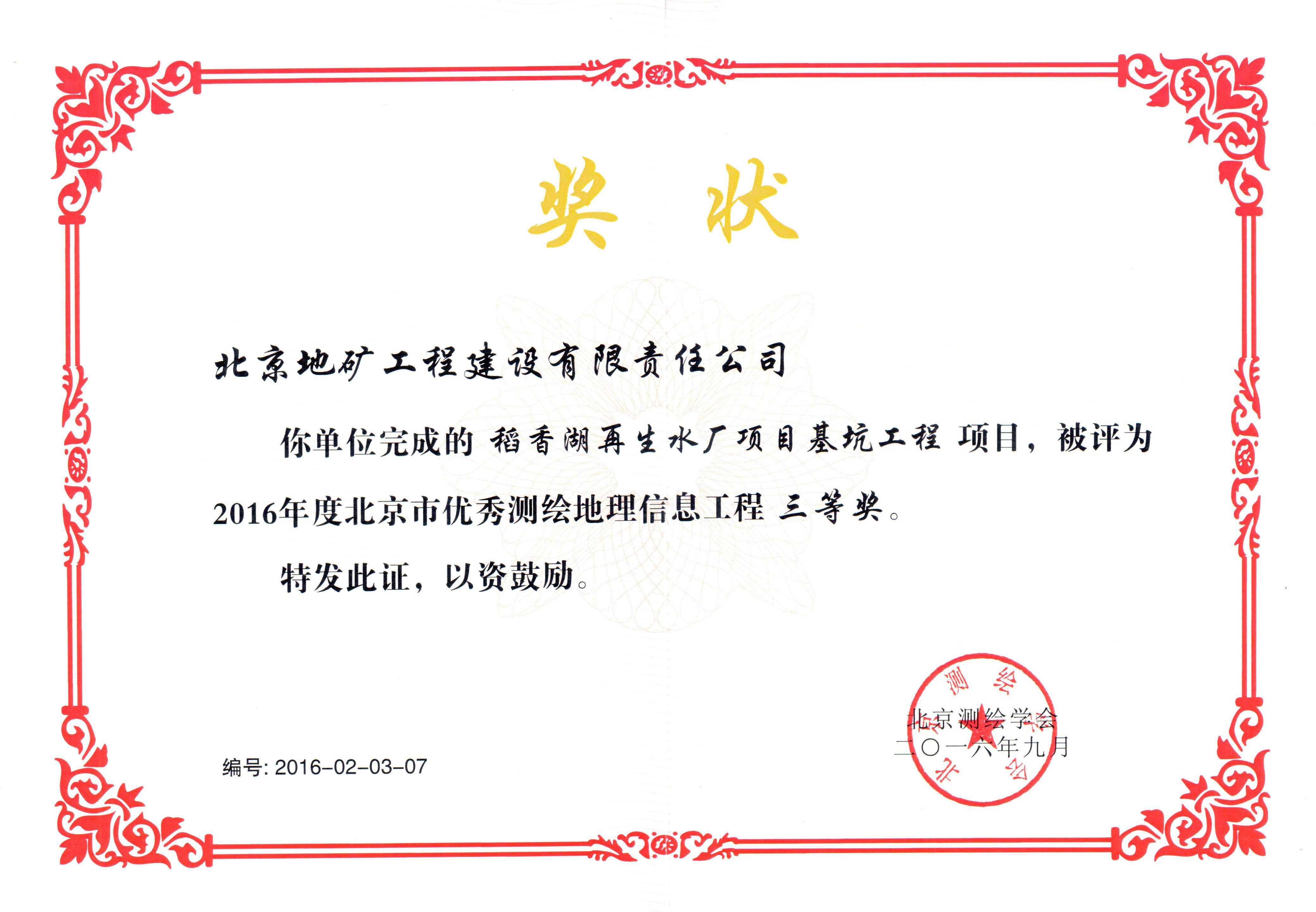 2016年北京測繪學會三等獎